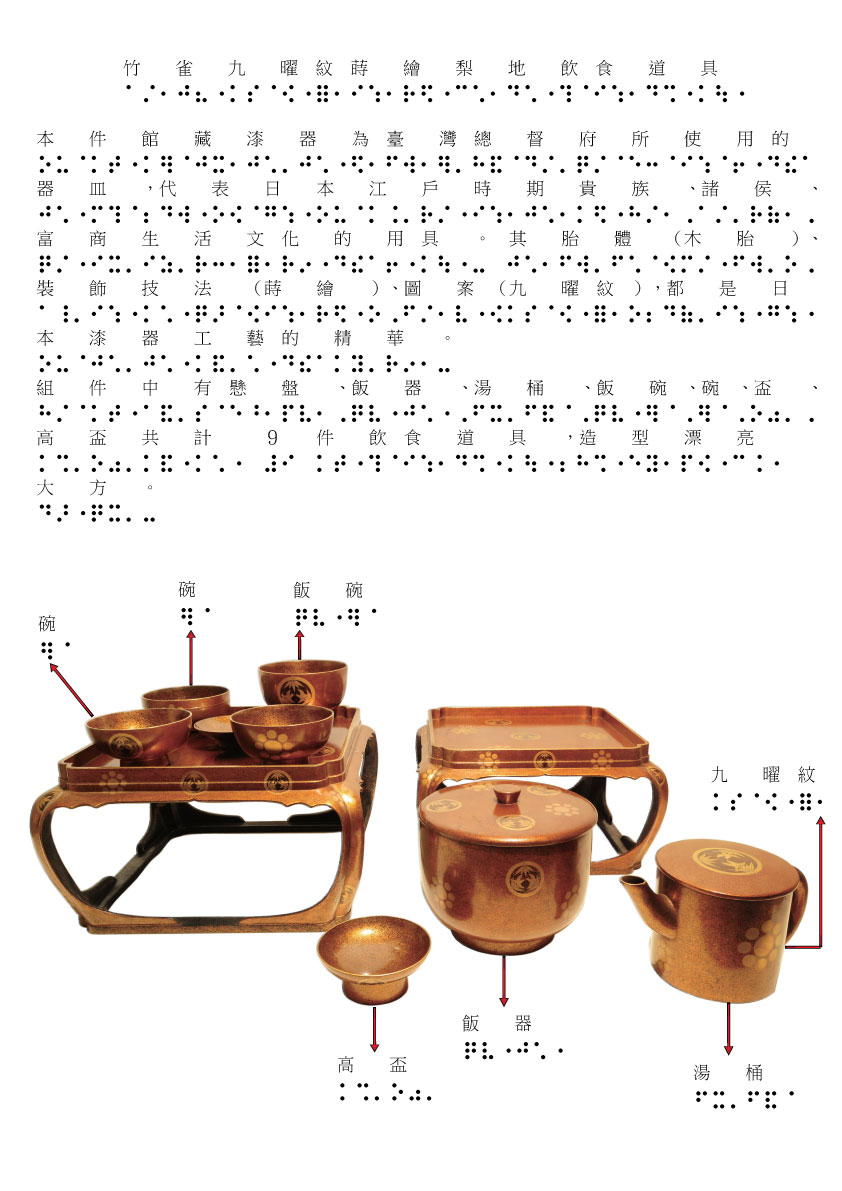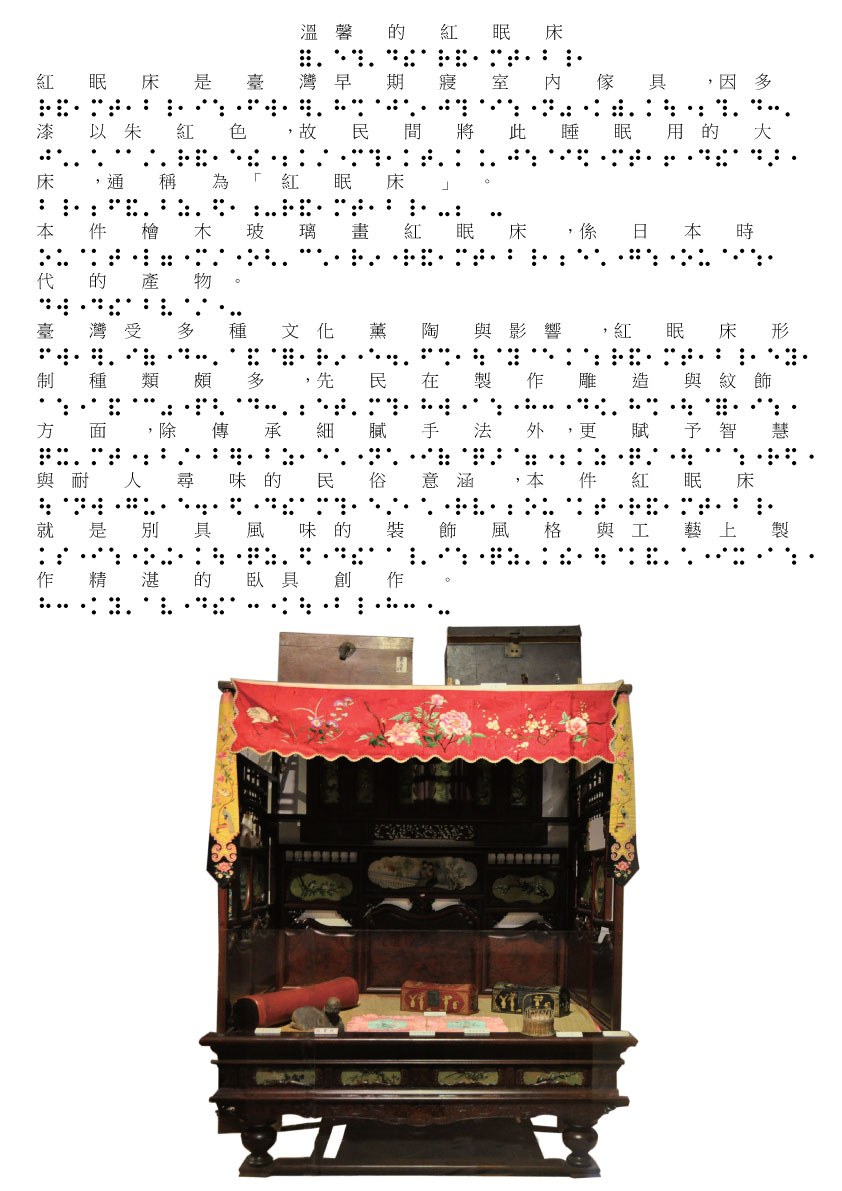本館自民國106年9月起,於文物、史蹟二大樓1-3樓各常設展示室入口前新增展示主題點字膠膜,歡迎視障者多加利用。