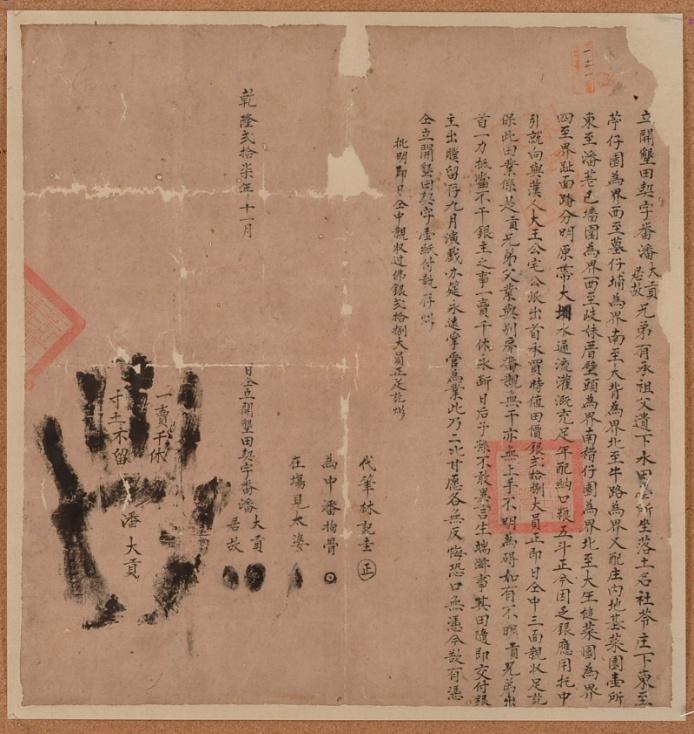 本館於民國91及92年間,經苑裡鎮公所林坤山主秘協助,引見當地耆老,進而獲得熱烈響應,進行古文書蒐集整理工作。累計採集整理各家族古文書1,339件,複製自38個當地家族或收藏家,其中明顯由社番立契而可以辨識其所屬社群的契字計有150件。從北而南,包括苑裡社、猫盂社、房裡社、日北社、雙藔社、日南社、大甲東社、大甲西社等,補足蓬山地區契字史料。而乾隆期的契字就有50件,對早期臺灣開發史研究頗有助益。 本件為清乾隆27(1762)年「開墾田契」。日北社番潘大貢、潘居故賣田予漢人,名為開墾,一賣千休。
