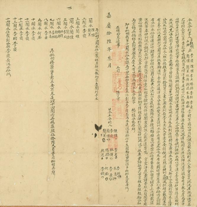 本件嘉慶16(1811) 年「仝立合約字」係草鞋墩山腳庄陳愷等計14鬮,照分鳩銀交圳長,作隘寮溝疏濬埤圳水道等,並不許私截水流或任意私相授受等。為本館典藏478件南投地區古文書之一。