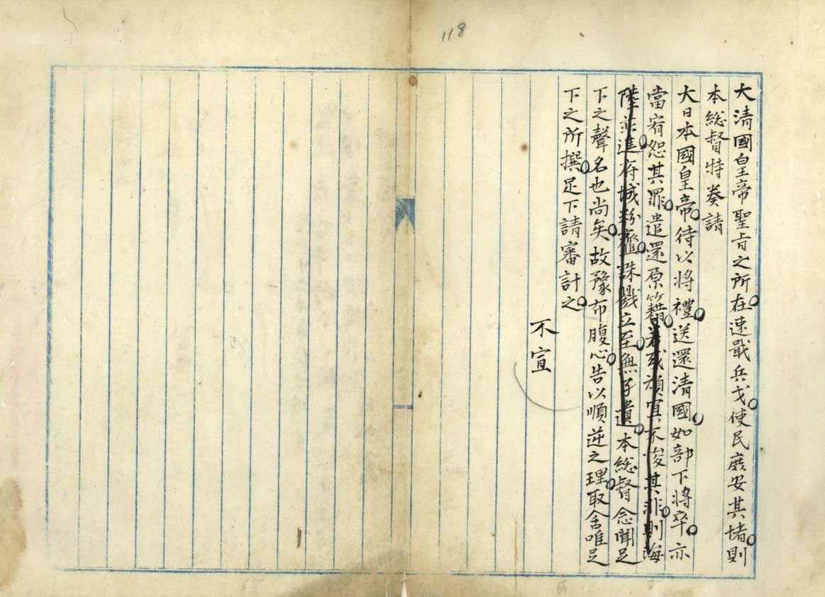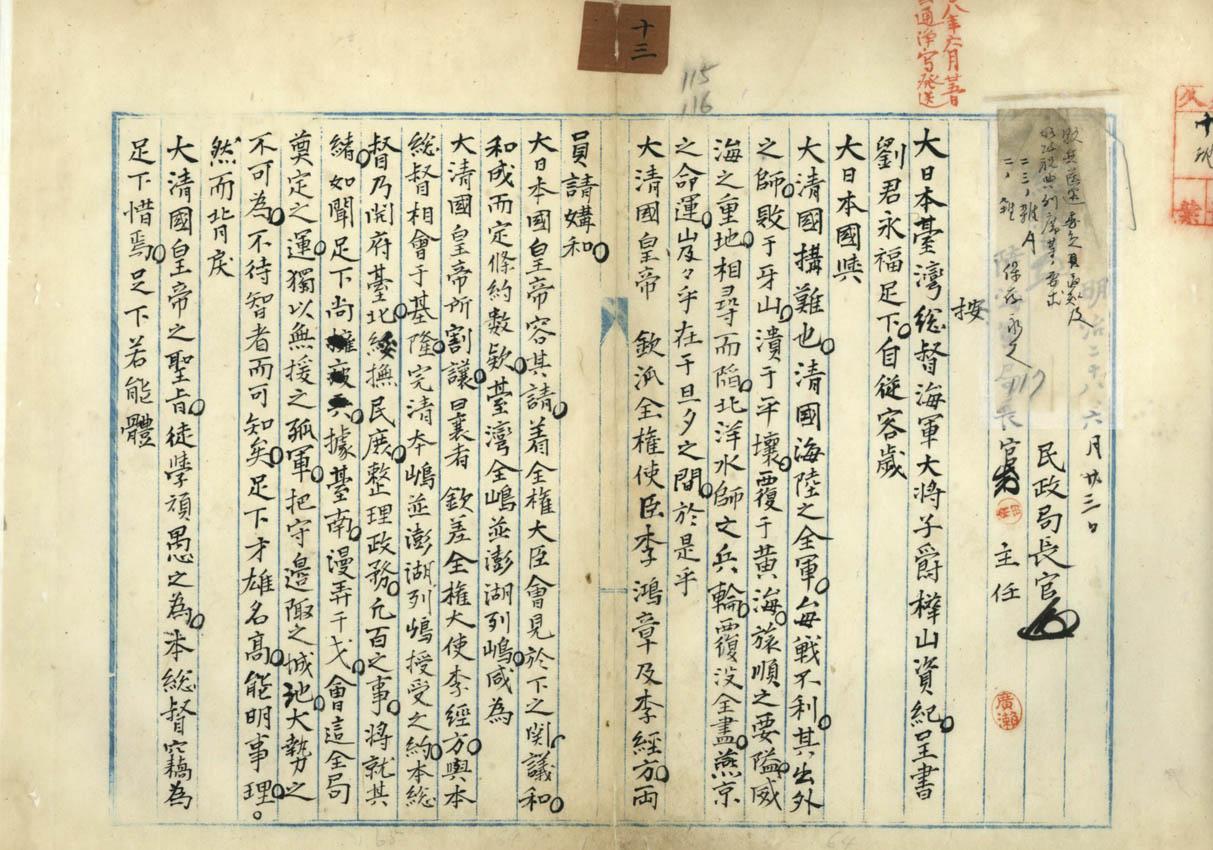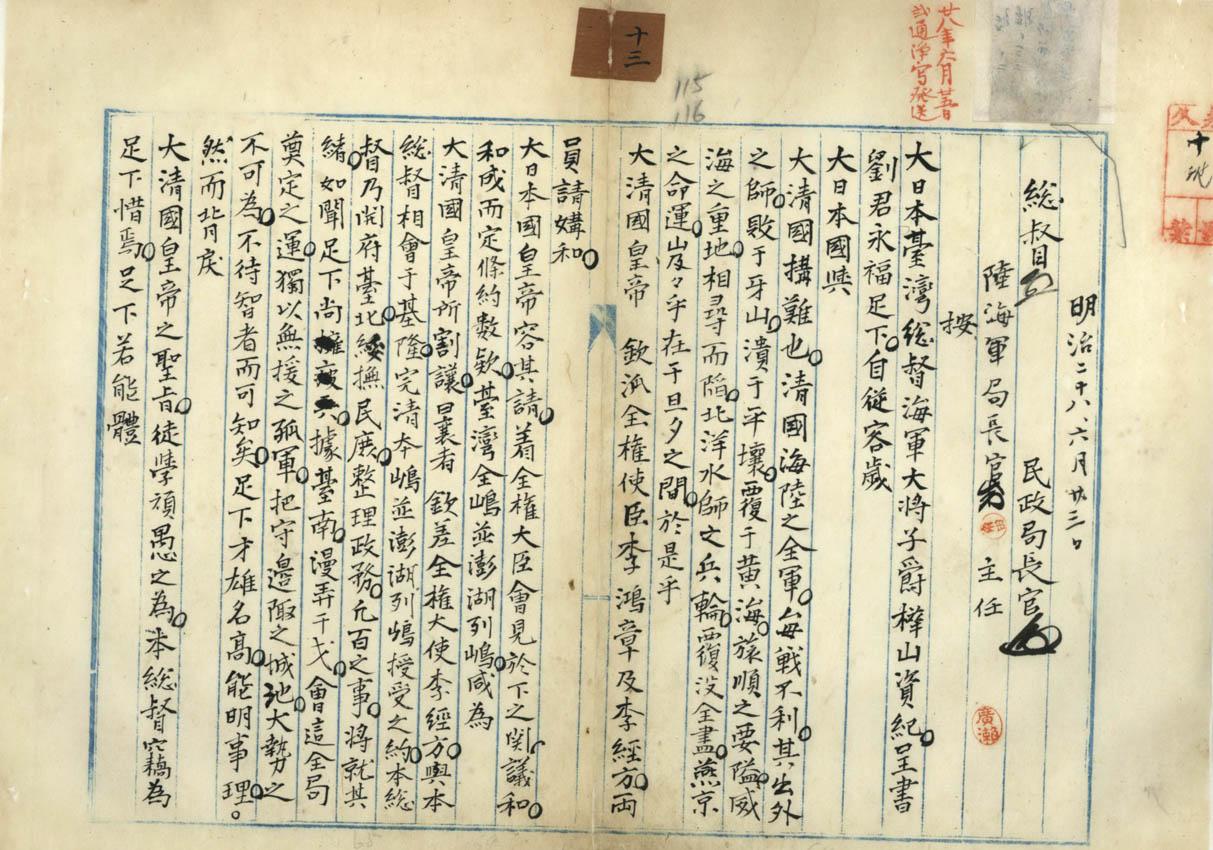 甲午戰後,李鴻章代表清國前往日本下關簽署喪權辱國之「馬關條約」,割讓臺灣及澎湖群島作為求和之賠償。當時臺灣人為力保臺灣,各地均有反抗義舉,使日本帝國接收臺灣工作比預期困難。本件檔案係首任臺灣總督樺山資紀於1895年7月致函劉永福招降,要求其遵守國際公法,勿再進行無謂之抗爭。