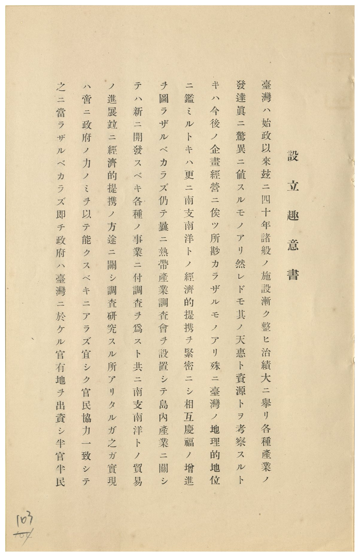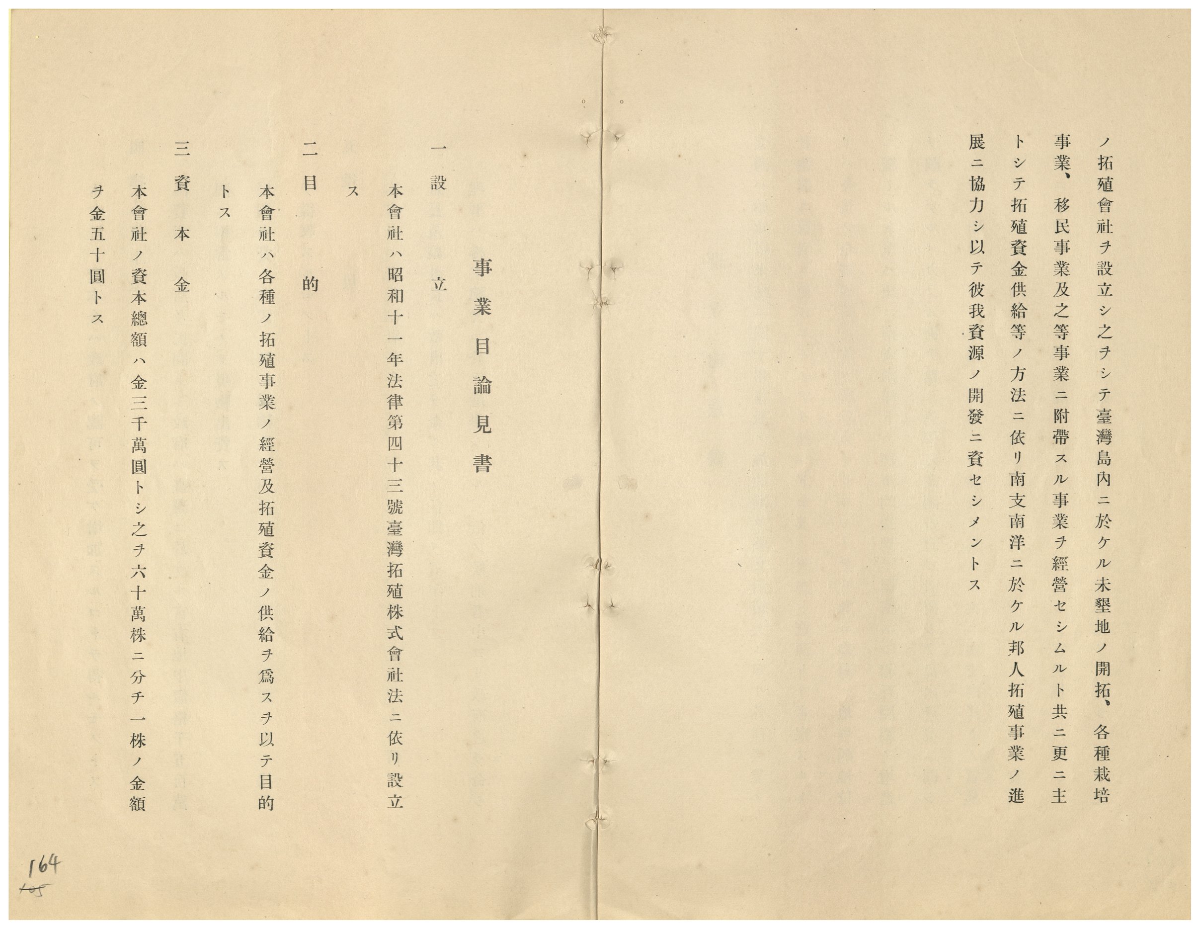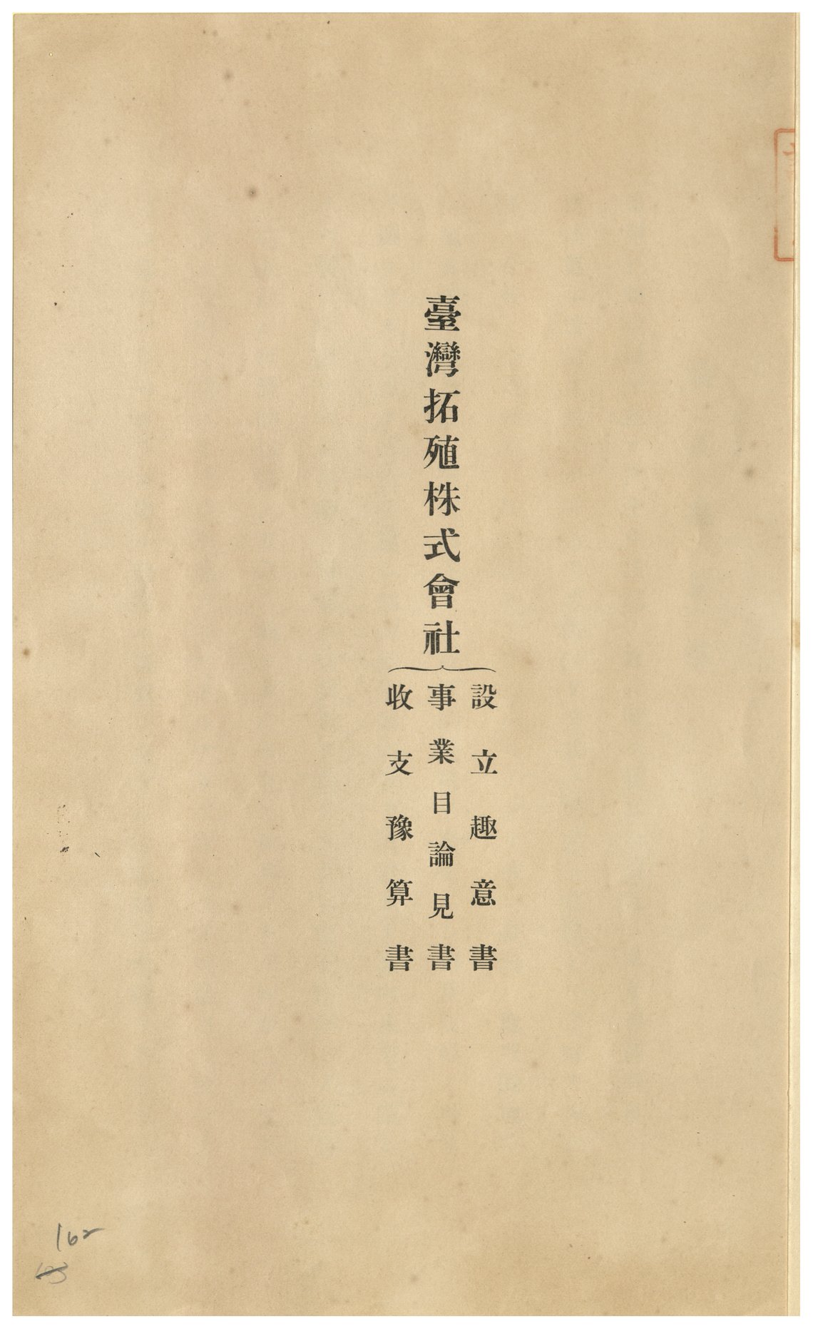 臺拓是臺灣總督府主導設立的拓殖型國策公司,其事業除臺灣本島外,還包括中國與南洋。本件包括臺拓設立趣意書,事業目論見書。由此可大約一窺臺拓設立的意圖。