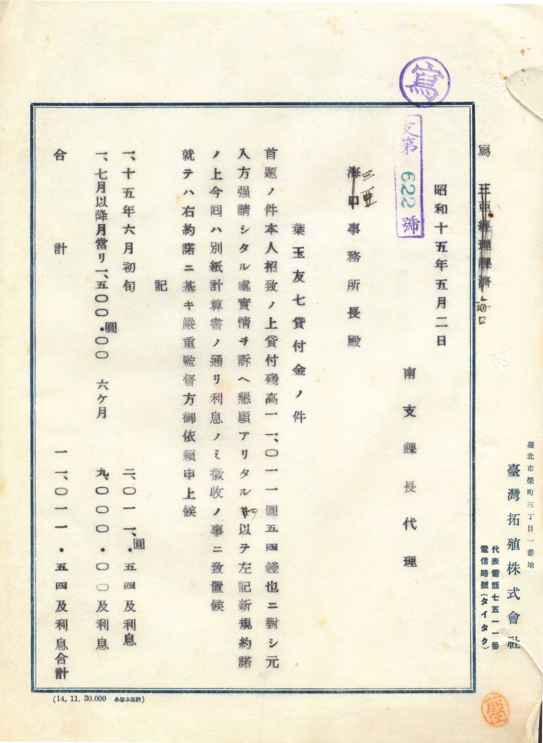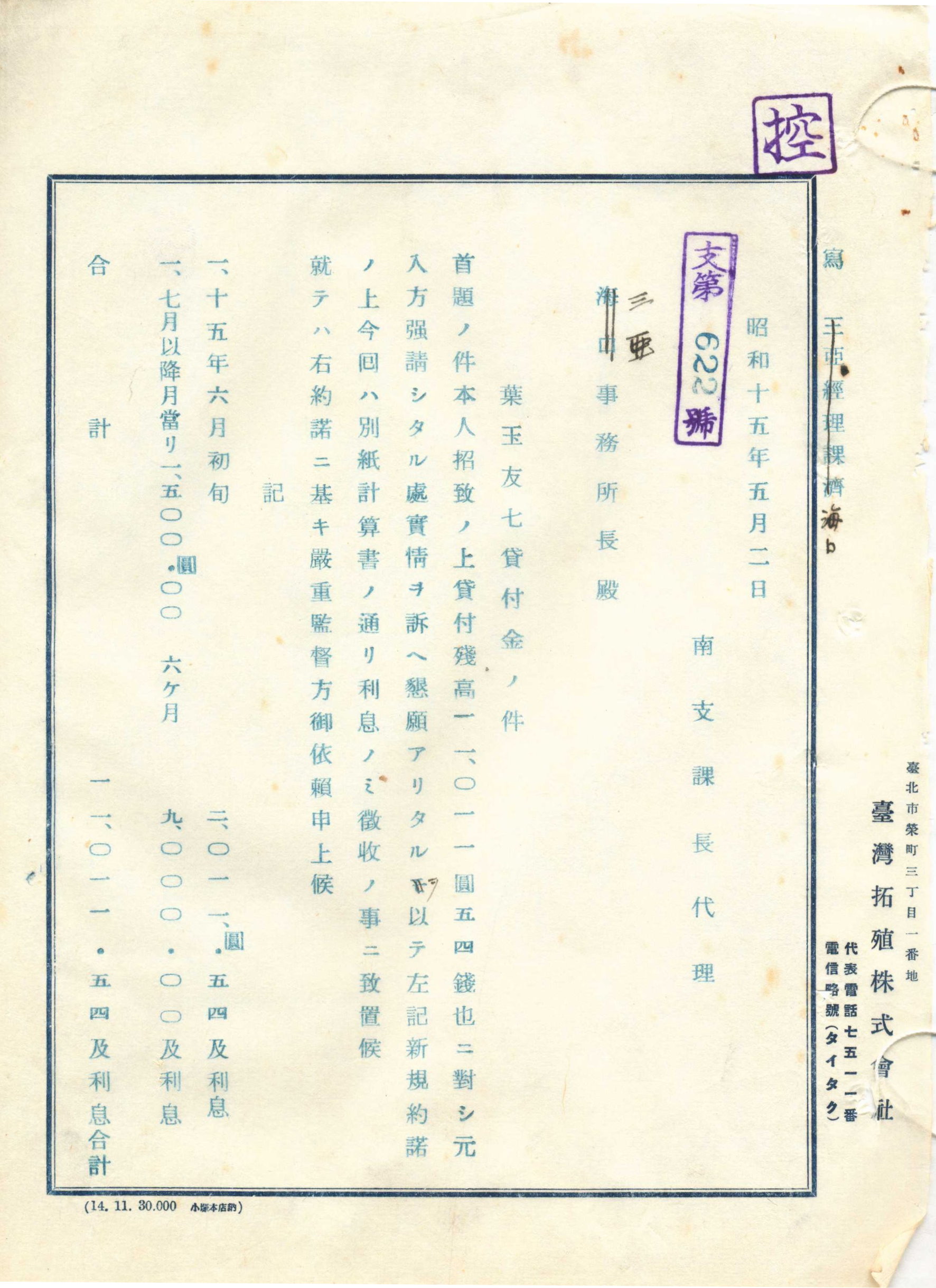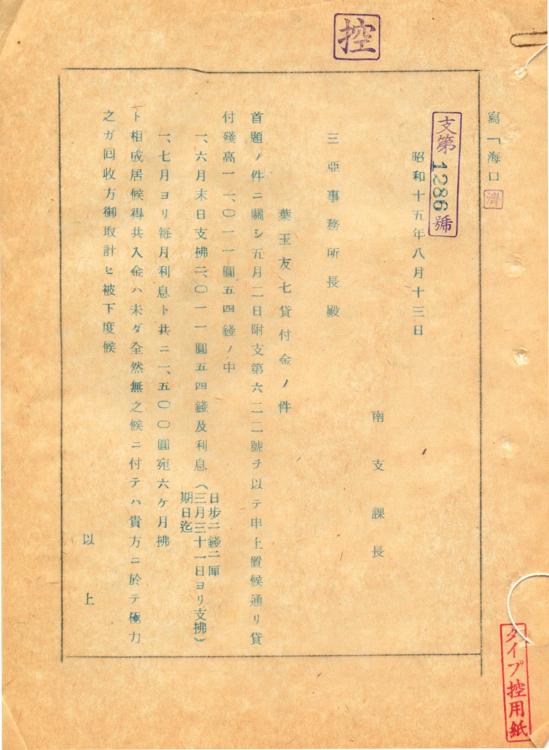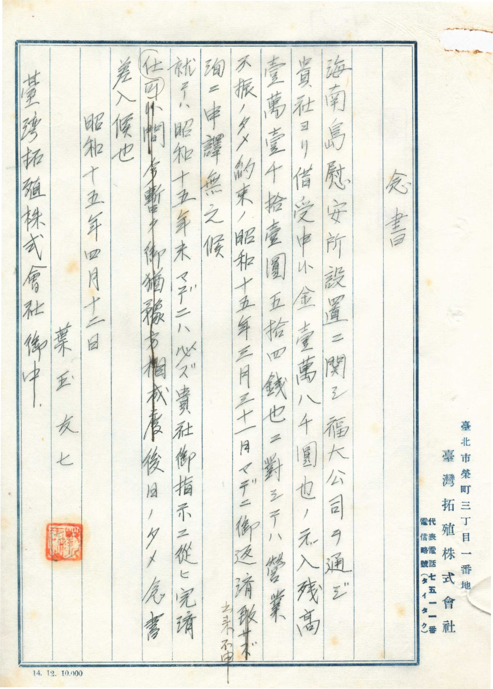 上述慰安所業者葉玉友七表示因軍隊調動而停止營業,請求延期還款。因而1940年5月重定貸款契約。