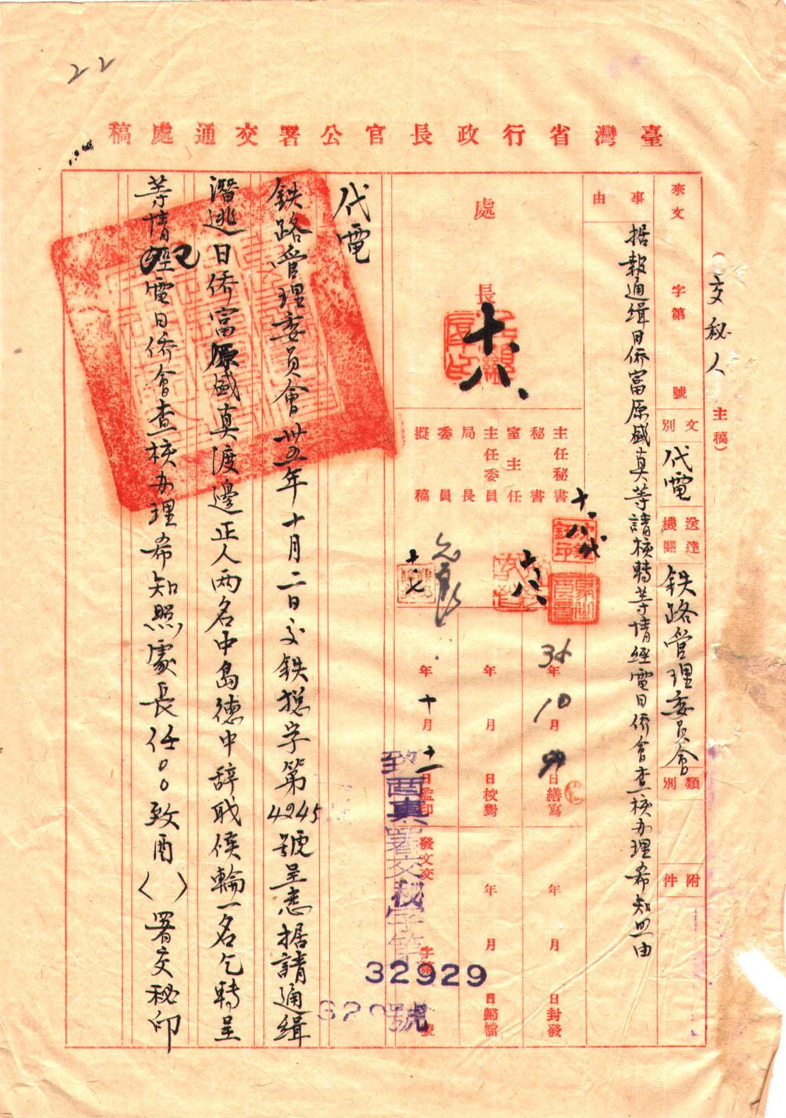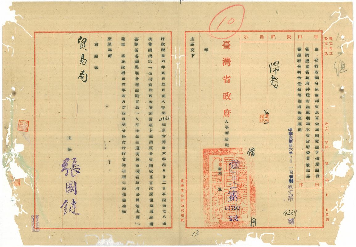 臺灣省行政長官公署於1945年10月25日正式成立,1947年5月16日撤銷,僅短短1年8個月,卻是日本統治結束到臺灣省政府成立的過渡時期,一個前所未有而特殊的行政體制。長官公署的政治體制、經濟制度、接收措施、人員編制、法規章程、施政方針及公營事業等。檔案內容,大體可分為4大類:總務類、民政類、財政類及附件(為檔案中所附之大量報表、清冊。包括政府機關人員名冊,各機關、公司行號移交清冊,接收日人在臺公私有土地登記表,開礦申請文件等)。計5千餘卷。