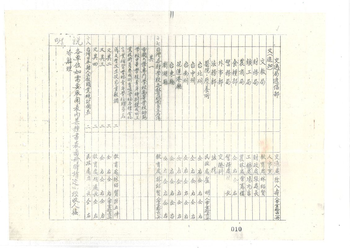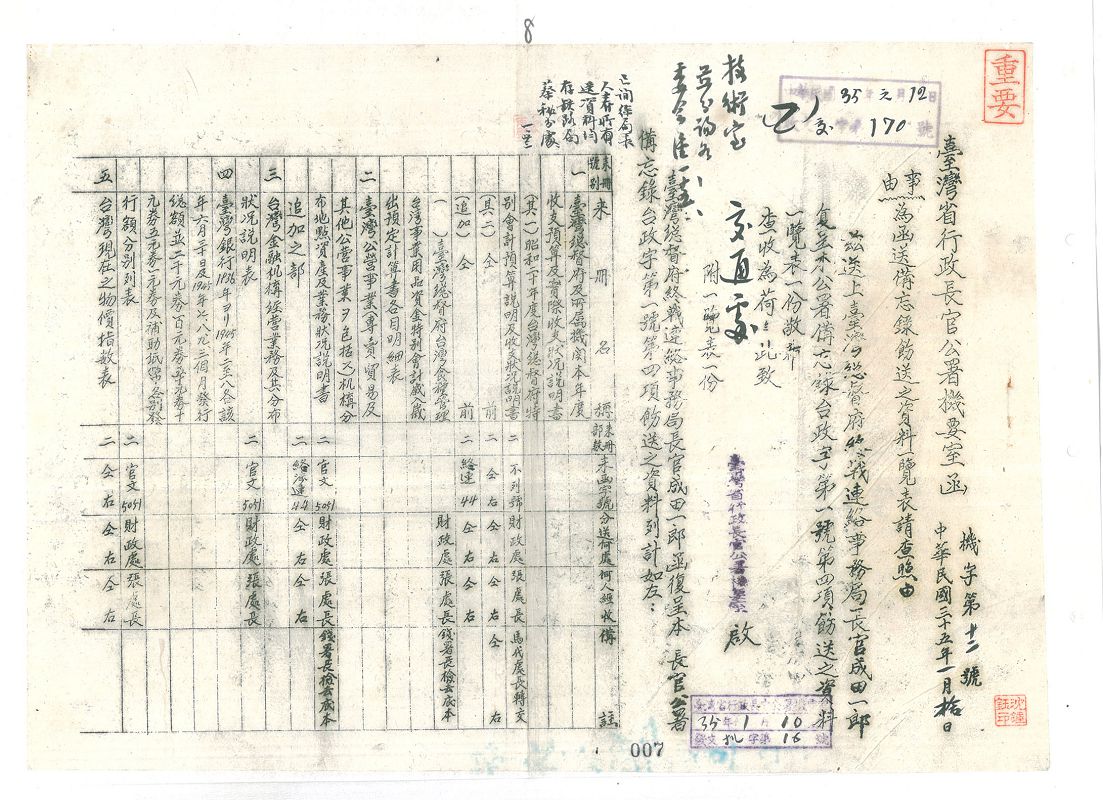 1945年8月日本宣布無條件投降。國民政府特派陳儀為臺灣省行政長官,綜理全臺政務。此文為陳儀以臺灣省行政長官身分向當時末任臺灣總督安藤利吉下達接收臺灣(含澎湖群島)命令。此即臺灣省行政長官公署備忘錄臺政第一號文件。