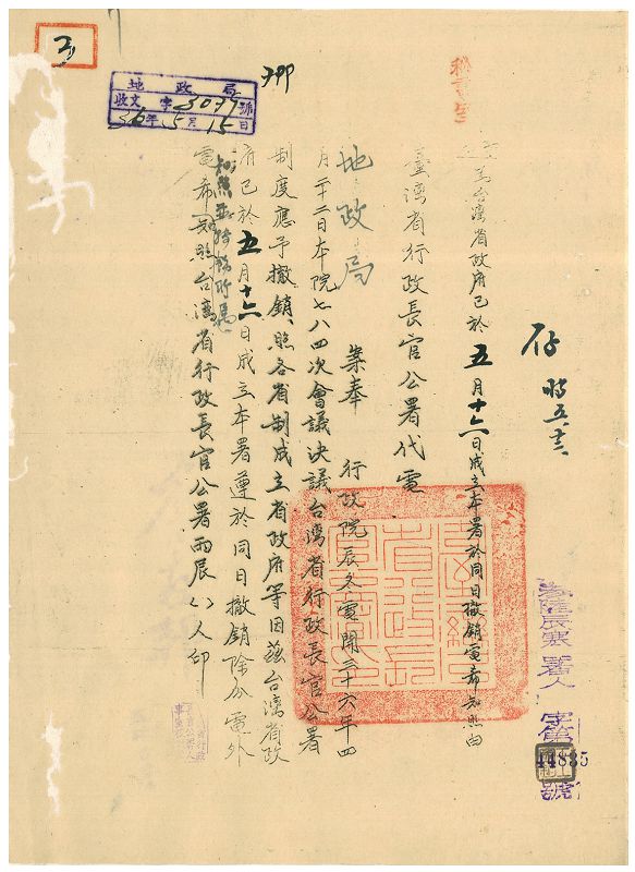 1945年10月25日臺灣省行政長官公署正式在臺成立,由陳儀擔任臺灣省行政長官兼臺灣省警備總司令,可謂集行政、立法、司法、軍政、經濟大權於一身,後因制度不良、物價飛漲等種種原因,致社會動盪不安。1947年2月28日爆發了二二八事件,國民政府為了安撫民情,乃於1947年5月16日將「臺灣省行政長官公署」撤銷,結束歷時1年8個多月的行政長官公署時期,而陳儀亦被革職。