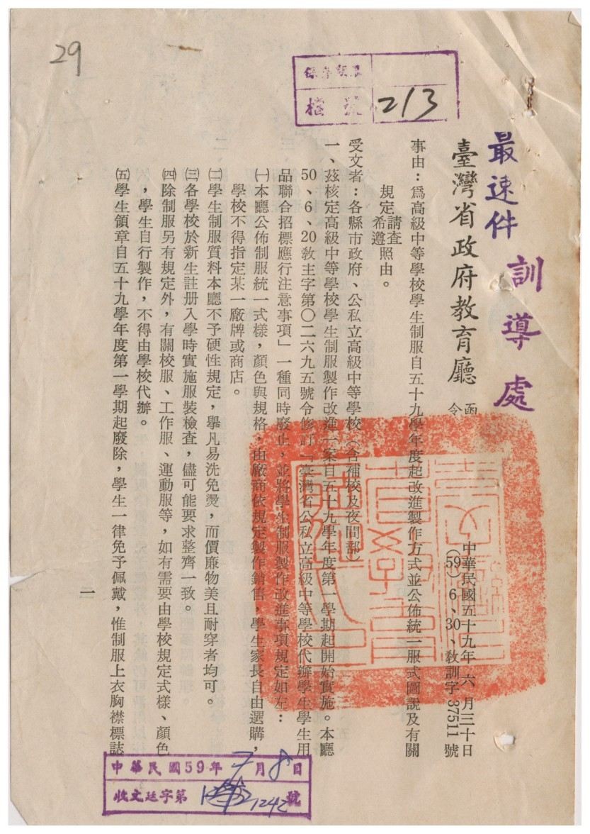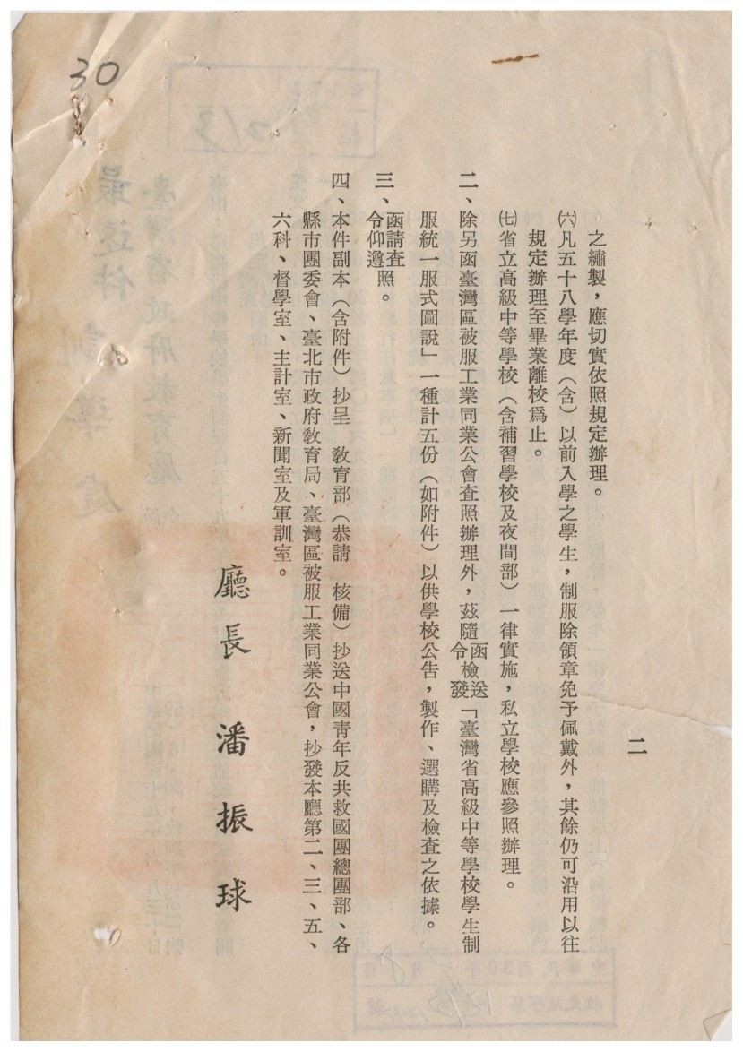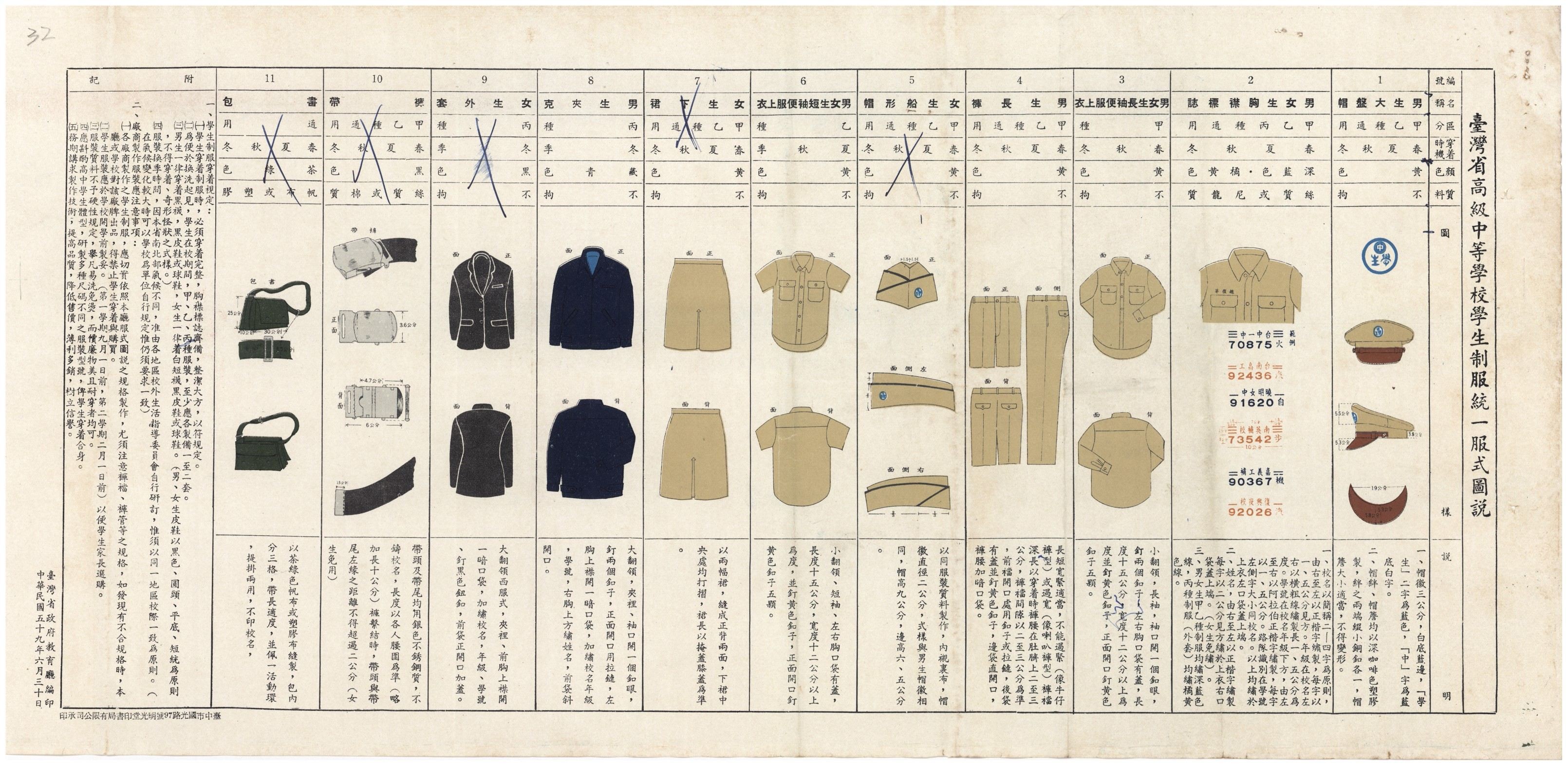 臺灣於戰後初期仍沿用日治時期的學生制服制度,以西式款式為主。當時全國高級中學生的制服,均由臺灣省教育廳統一規範樣式及圖說。早期由各校依規定招標代為採購,自1960 年起改為廠商依規定製作銷售,學生家長自由選購,並廢除學生領章。制服款式方面,男學生著大圓盤帽、便服上衣、長褲及夾克,配黑襪黑鞋;女學生著船型帽、便服上衣、下裙及外套,配白襪黑鞋。男女胸襟皆繡上校名及學號,而男生須加繡姓名,女生則免。