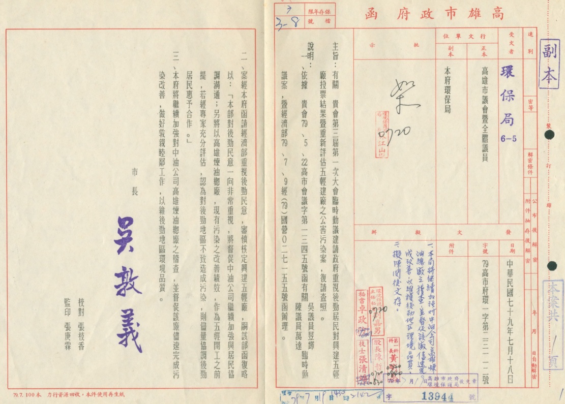 石化產業與環境,一直是高雄發展重要議題,從日治時期的海軍第六燃料場,到戰後的中油高雄煉油廠,使高雄成了重要的石化產地,1987年更決定在高雄後勁興建第五輕油裂解廠(五輕),並納入當時行政院十四項建設。但此一政策,引起後勁地區居民和環保人士不滿,並展開長期的反五輕運動,此件為1990五輕動工興建前,高雄市政府答覆議會對五輕興建的質詢。