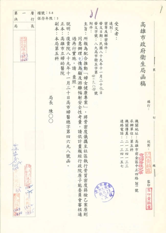 1996美國食品藥物管理局雖已核准Quantitative Ultrasound Bone Densitometry(定量超音波骨質密度儀,QUS)的臨床應用,但是因缺乏本土數據及超音波應用上對不同年齡族群的差異性和精準度,加上國內代理廠商引進速度所限,在本世紀初期,國內非侵入性骨質密度量測,仍以過去發展的技術包括:single photon absorptiometry (單光子吸收量測儀,SPA), single X-ray absorptiometry (單能量吸收量測儀,SXA), dual X-ray absorptiometry (雙能量吸收量測儀,DXA), and quantitative computed tomography (定量電腦斷層儀,QCT)為主,但這些儀器均具有游離輻射源,因此使用上需受游離輻射防護法管理與限制。本件為2000年高雄市立婦幼醫院為辦理婦女健康專案活動,攜帶骨質密度儀到社區為居民進行檢測,衛生局回函要求該院先行向行政院原子能委員會申請。但此之後,不到短短幾年,今日臺灣即已普遍利用QUS為社區居民進行骨質密度篩檢,本件反而難得留下利用游離輻射性骨質密度儀進行社區居民骨質密度篩檢的紀錄。